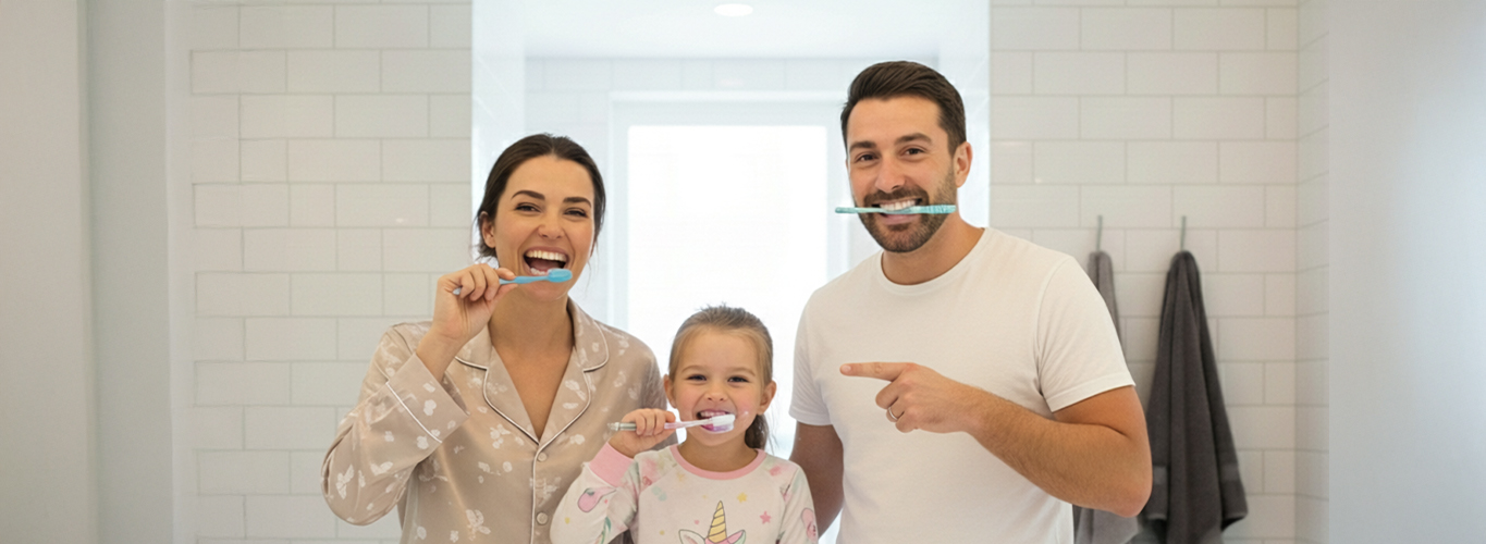 Lavarsi i denti insieme non serve solo a prevenire le carie. È un attimo, alla fine di una giornata frenetica, in cui ridete con la bocca sporca di dentifricio e vi prendete cura di voi stessi, insieme. State costruendo un ricordo felice legato alla salute: un regalo che i vostri figli e figlie porteranno con sé per tutta la vita.